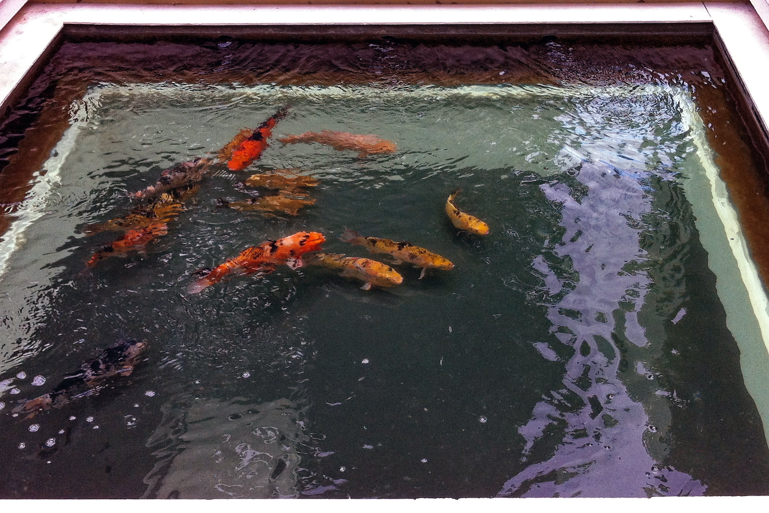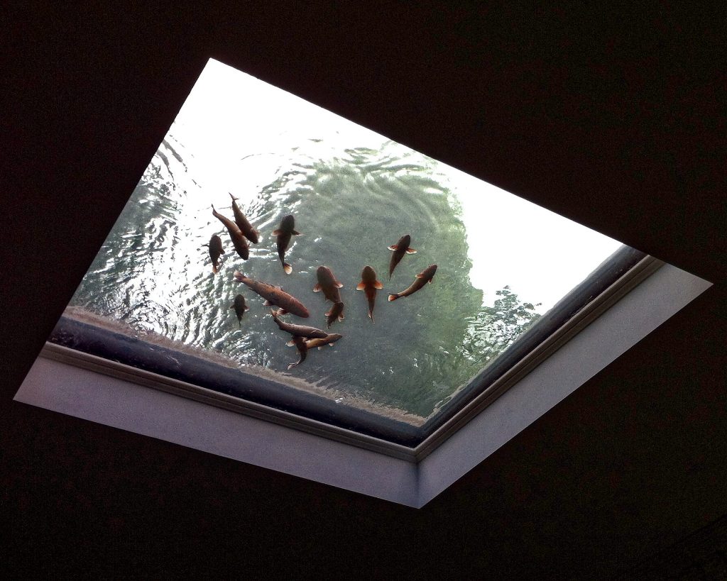 Le fond du bassin est composé d’une vitre pour permettre de laisser entrer la lumière dans la piscine située en dessous et de profiter des poissons par le dessous.